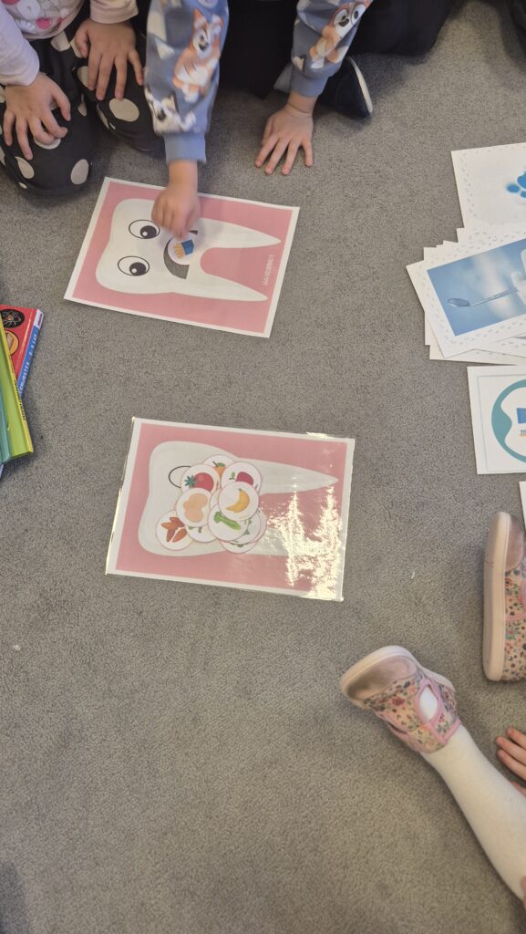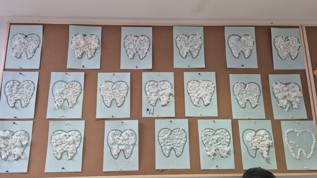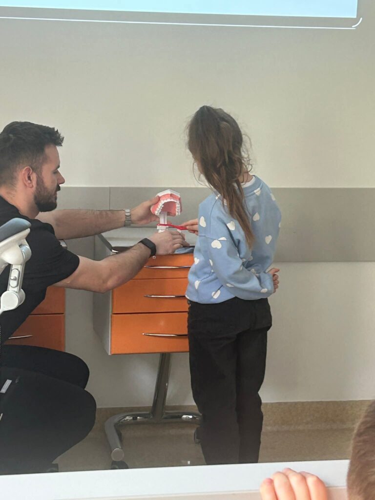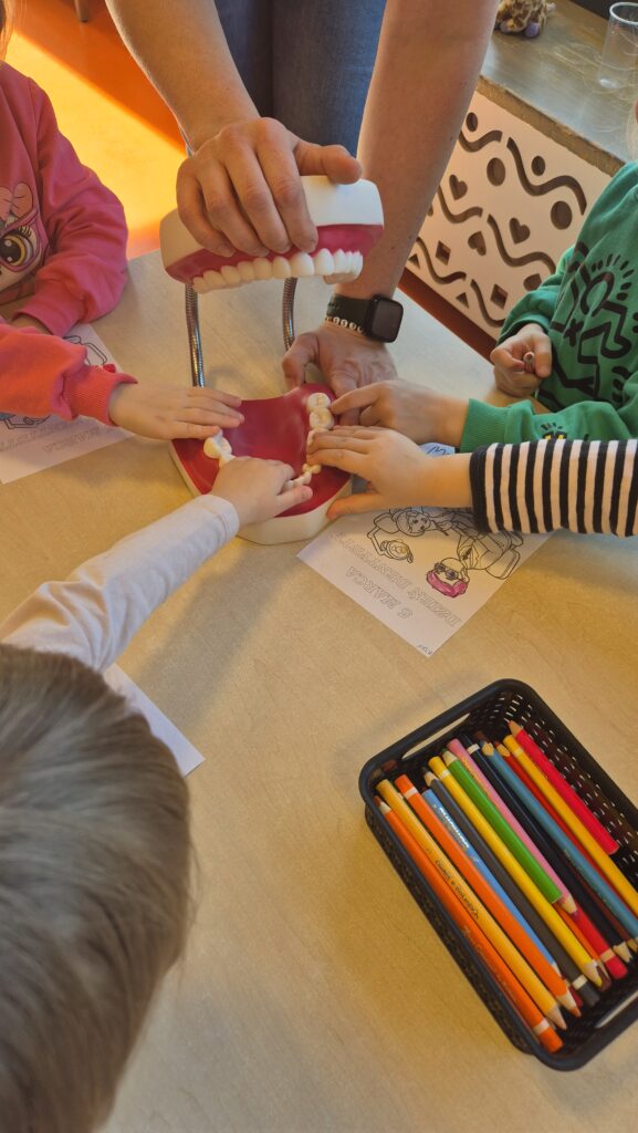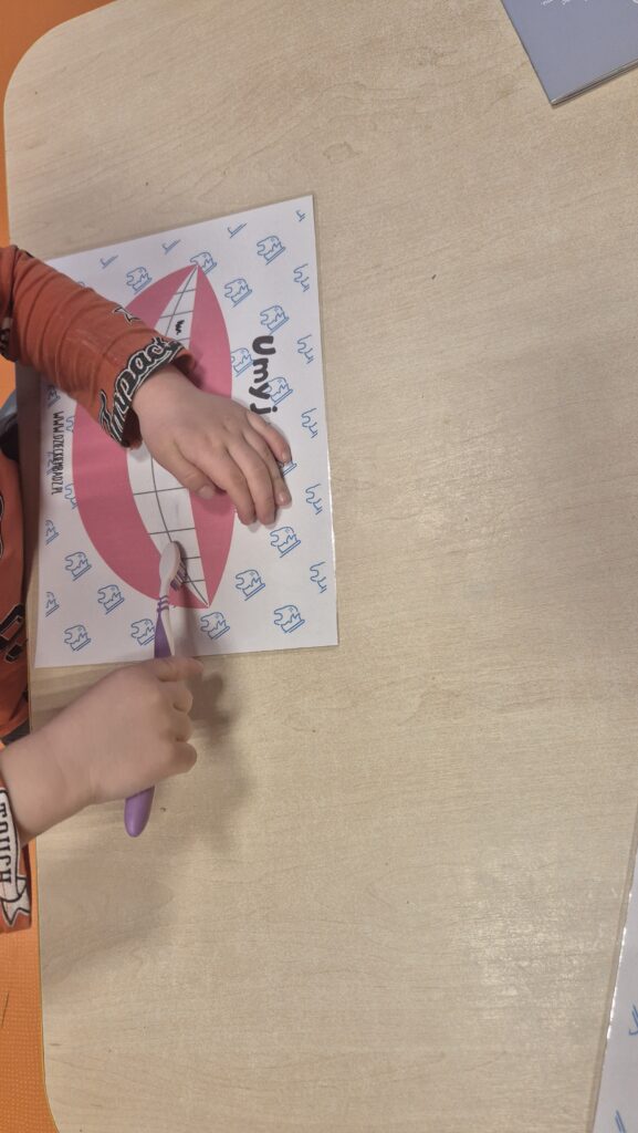 Przedszkolaki dowiedziały się, jak prawidłowo szczotkować zęby, jakie produkty sprzyjają zdrowemu uśmiechowi oraz dlaczego warto regularnie odwiedzać dentystę. Podczas zajęć nie zabrakło ciekawych rozmów, zabaw edukacyjnych oraz wspólnego utrwalania zasad dbania o zęby.